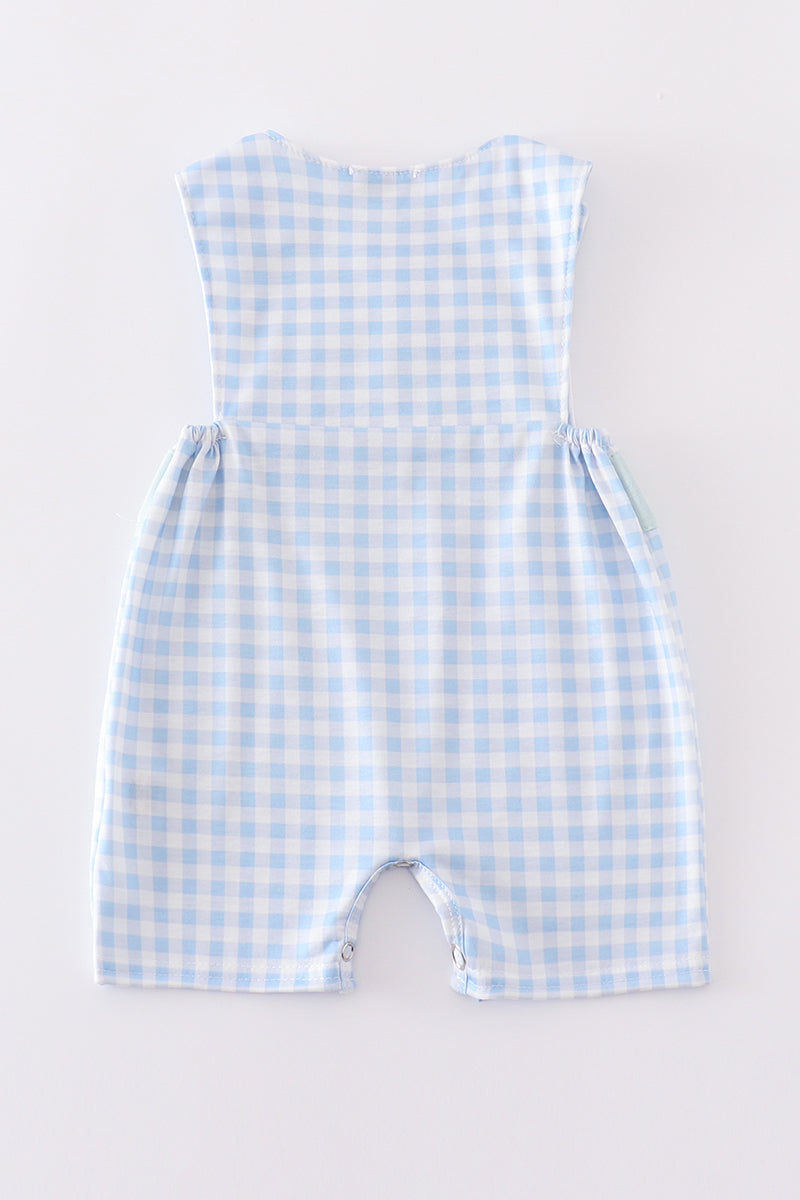 Hop into style with our blue bunny embroidered gingham jonjon! This playful one-piece features an adorable bunny design and classic gingham print. Perfect for your little one's wardrobe!