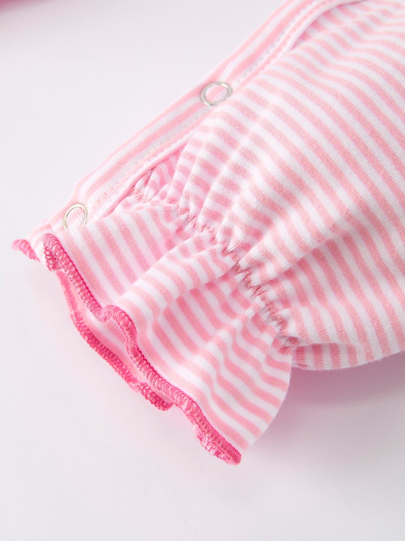 Celebrate the holiday season in style with this adorable Christmas Santa applique romper for baby girls. Featuring festive stripes and a charming red ruffle trim, it combines comfort with cuteness. Perfect for holiday photos or cozy winter days, this romper keeps your little one looking joyful and feeling snug. Make every moment merry with this delightful seasonal outfit.