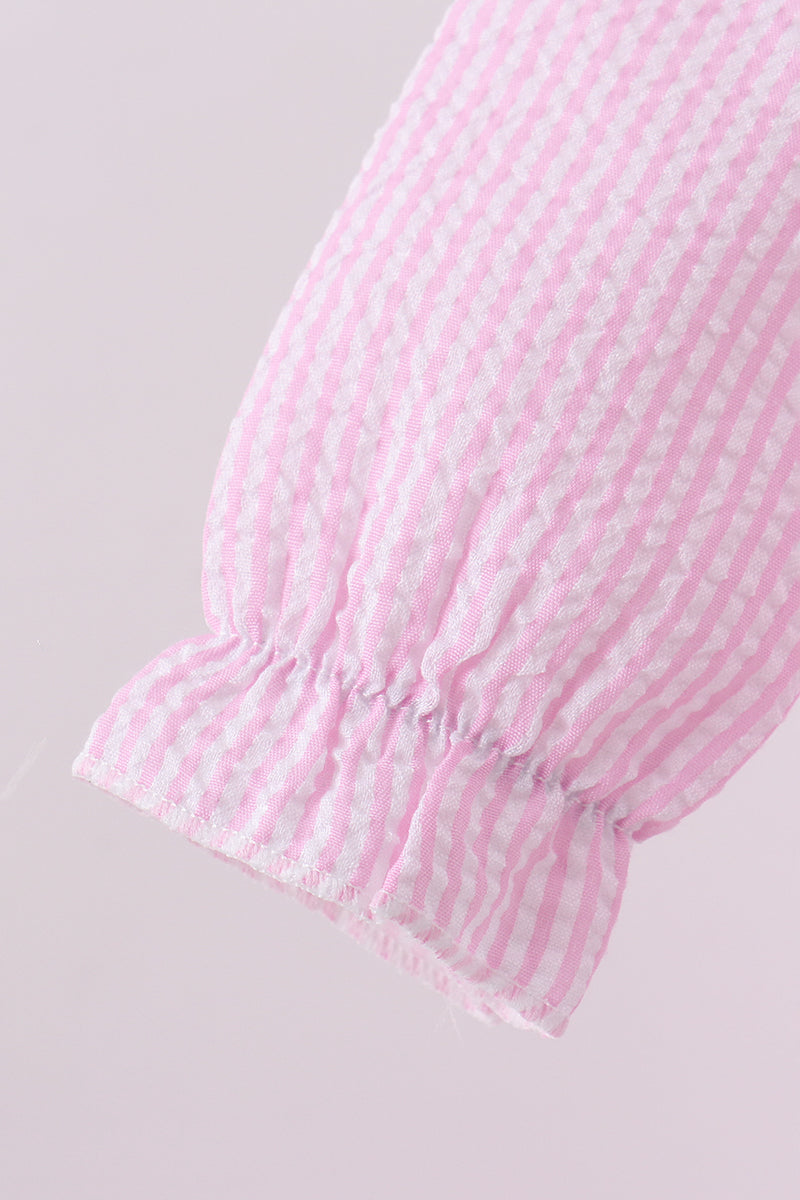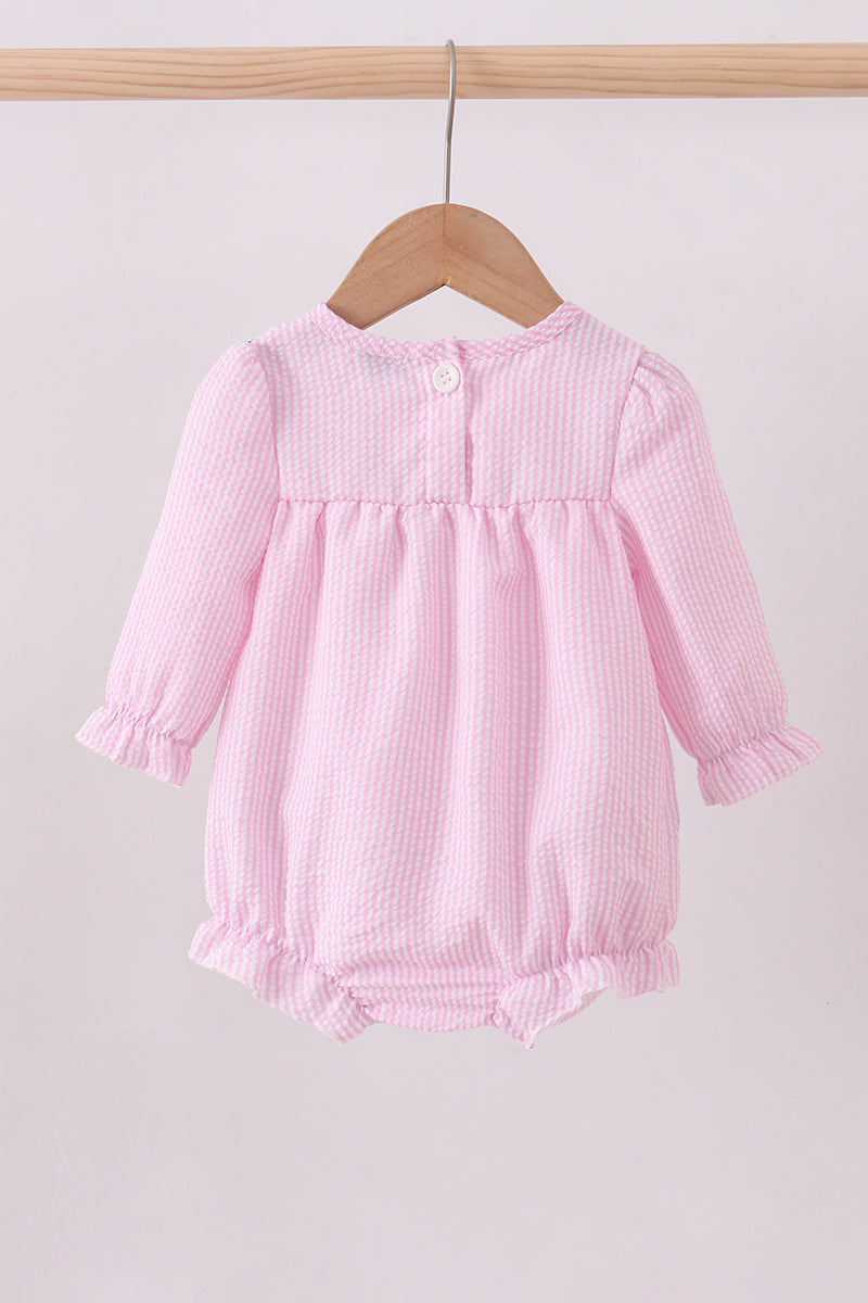 Adorable bubble romper featuring a charming pink clover applique set against classic seersucker fabric. The textured weave adds visual interest while keeping things light and breezy, perfect for warm weather adventures. Playful details make this piece an instant favorite for little ones who love standing out. Comfortable fit ideal for playdates, family outings, or everyday wear.