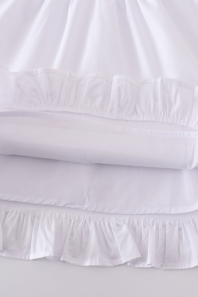 This premium dress features delicate white floral embroidery and playful ruffle details, adding a touch of elegance to your wardrobe. Perfect for any occasion, this dress will surely turn heads and make you stand out with its unique and quirky design.