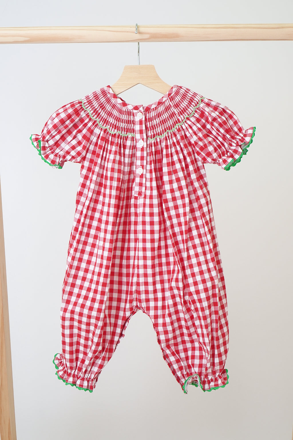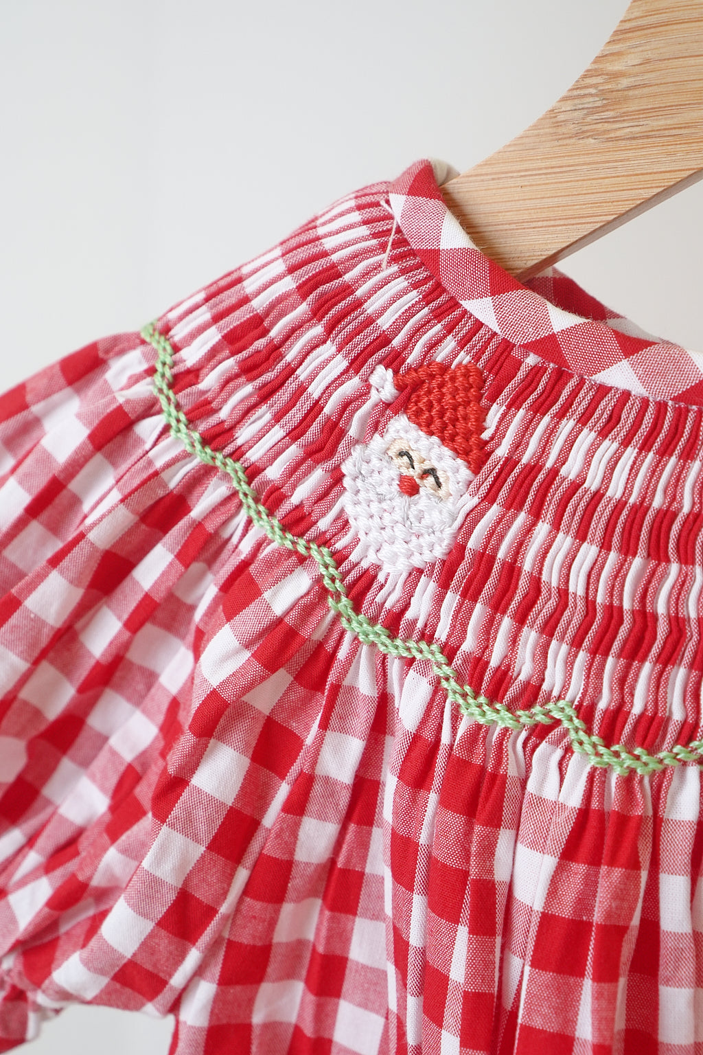 Get ready for the festive season with this adorable red Christmas smocked romper! Featuring playful santas, trees, and reindeer on soft gingham fabric, your little one will be the star of any holiday gathering. Perfect for cute and cozy holiday photos.