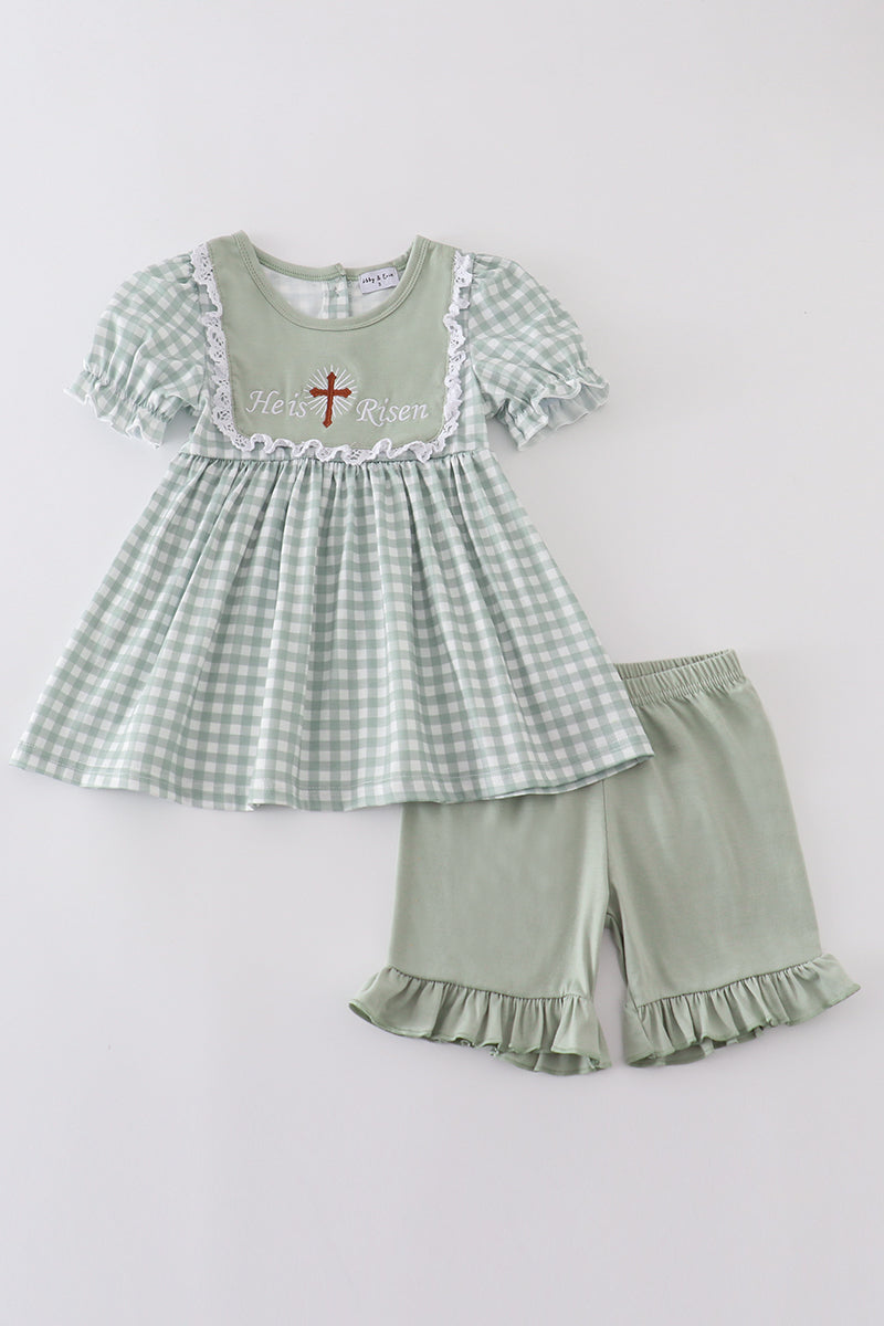 Celebrate Easter with our Sage "He Is Risen" cross embroidery girl set! This adorable set features a sage green color and beautifully embroidered cross, perfect for any holiday occasion. Spread the joy and hope of Easter with this unique and playful outfit.