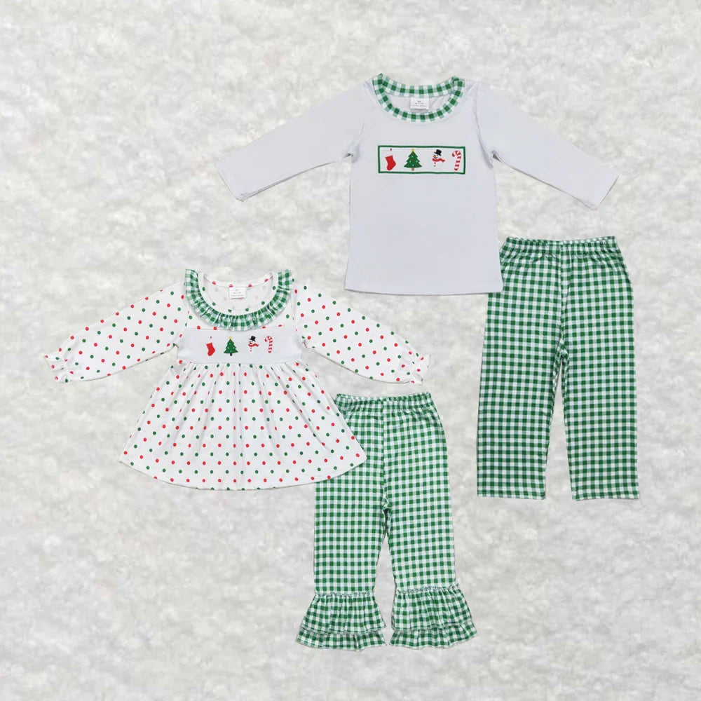 Wholesale western boutique Children's Clothing Baby Boys&Girls Embroidered Christmas tree Snowman Sibling Styles Clothes Sets